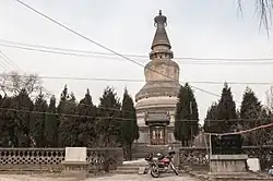 The county seat of Guangwu moved to what is now Shangguan under the Northern Wei.[12] An earthen wall 8 li in circumference was raised to protect the town.[22] It became the seat of Dai Prefecture in 585 during the Sui,[3] eventually taking its name as Daizhou. The prefecture covered parts of the present-day counties of Dai, Fanshi, Wutai, and Yuanping.[3] The Ayuwang Pagoda was also first constructed under the Sui, but suffered repeated fires; the present Tibetan-style dagoba dates to the Yuan. The town was also known as Yanmen during this period, as it was the seat of the Yanmen Commandery.[23] On 11 September 615,[24][25] the Sui emperor Yang Guang (posthumously known as the Yang or Lazy Emperor) was besieged there by the Eastern Turkish (Tujue) leader Shibi Khan, who was angry about Chinese efforts to weaken and divide his realm. In his distress, Yang Guang promised promotions and rewards to the garrison and those who might rescue him. Credit became muddled, however, when the khan's Chinese wife Princess Yicheng responded to his pleas by sending a false report to her husband about an attack on the Turkish homeland. After the Turks withdrew, the emperor chose to renege on most of his promises; the event built animosity in the Chinese army ahead of the collapse of the Sui.[23]