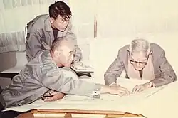 Yanosuke Hirai (near, central) guiding Emperor Akihito (then His Imperial Highness the Crown Prince) who visited the CRIEPI (Komae) in 1965.