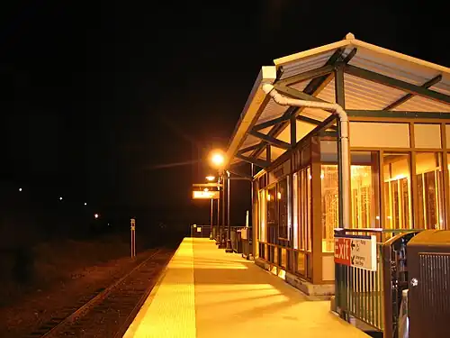 The Yaphank station's platform at night in 2006, looking west | |||||||||||||