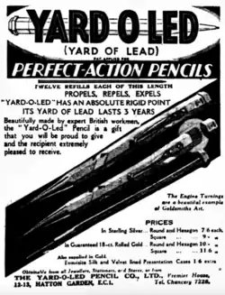 It was founded by German immigrant Ludwig Brenner[1] to produce his patented propelling pencils which contained twelve three inch leads (that is to say, 36 inches or a yard of lead). Originally based in Premier House, 12-13 Hatton Garden, London, the company relocated in the late 1940s to 1 Great Cumberland Place, London.