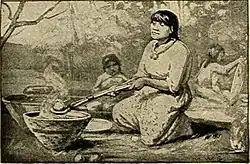 Among the Timucua, a type of black drink was called cacina by the Spanish and spelled casino in Pareja's Timucua writings. The preparation and consumption of the drink were strictly limited to the community council house. Women (other than an occasional female chief) were normally excluded from the council house except for activities such as dances, but did prepare the cacina. In 1678 a bedridden cacica (a female chief) was given permission to brew and consume cacina in her house, on the condition that no one else could be present while she did so.[39] The first sip of the black drink was called in Timucua casinomucu "eye of cacina".[40] The Timucua use of yaupon tea was also discussed by French explorers to Florida, who explained how it was used in purification ceremonies as an emetic by the men, with the tribal chief drinking first, and then the warriors.[2]