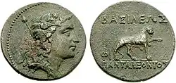 During the two centuries of their rule, the Indo-Greek kings combined the Greek and Indian languages and symbols, as seen on their coins, and blended Greek and Indian ideas, as seen in the archaeological remains.[15] The diffusion of Indo-Greek culture had consequences which are still felt today, particularly through the influence of Greco-Buddhist art.[16] The ethnicity of the Indo-Greek may also have been hybrid to some degree. Euthydemus I was, according to Polybius,[17] a Magnesian Greek. His son, Demetrius I, founder of the Indo-Greek kingdom, was therefore of Greek ethnicity at least by his father. A marriage treaty was arranged for the same Demetrius with a daughter of the Seleucid ruler Antiochus III. The ethnicity of later Indo-Greek rulers is sometimes less clear.[18] For example, Artemidoros (80 BC) was supposed to have been of Indo-Scythian descent, although he is now seen as a regular Indo-Greek king.[19]
