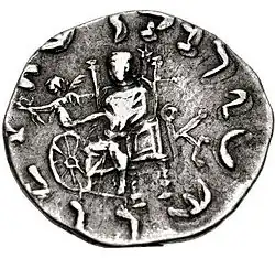 - ^ "It is probable that the wheel on some coins of Menander is connected with Buddhism", Narain, The Indo-Greeks, p. 122
