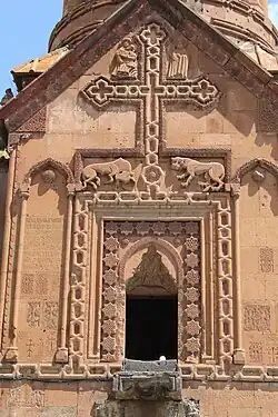 Exceptionally rich decorations cover a large portion of the church. There are beautiful motifs on each side at the second floor level and geometric patterns around the cornices, eaves, and other parts of the walls. Notable is the large cross carved in high relief on the front flanked by the Virgin Mary holding the baby Jesus and another saint. Below and just above the portal to the second floor are the motifs of a bull and lion. Above the larger window on the right façade is a motif of a large bird with a geometric rosette on its chest holding a hooved animal in its talons. On the left façade is a mountain goat, and on the rear is a large cat pouncing upon a goat.