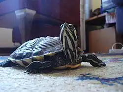 Adult male yellow-bellied sliders typically reach 5–9 inches (13–23 cm) in length; females range from 8–13 inches (20–33 cm).[8] Melanistic males have been seen to grow larger than nonmelanistic males.[9] The carapace (upper shell) is typically brown and black, often with yellow stripes. The skin is olive green with prominent patches of yellow down the neck and legs. As the name implies, the plastron (bottom shell) is mostly yellow with black spots along the edges. Adults tend to grow darker as they age.[10][11] Yellow-bellied sliders are often confused with eastern river cooters, who also have yellow stripes on the neck and yellow undersides, but the latter lack the green spots characteristic of this species. The yellow belly often has an "s"-shaped yellow stripe on its face. They also have markings shaped like question marks on their bellies. Females of the species reach a larger body size than the males do in the same populations.[12] There have also been studies that show females of this species have more symmetrical shells than males due to either more efficient growth or less hormonal stress.[13] Other studies show that shells tend to grow more asymmetrical with age.[14]