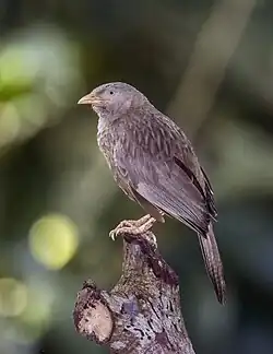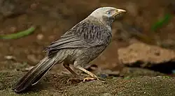 The yellow-billed babbler (Argya affinis) is a member of the family Leiothrichidae endemic to southern India and Sri Lanka. The yellow-billed babbler is a common resident breeding bird in Sri Lanka and southern India. Its habitat is scrub, cultivation and garden land. This species, like most babblers, is not migratory, and has short rounded wings and a weak flight and is usually seen calling and foraging in groups. It is often mistaken for the jungle babbler, whose range overlaps in parts of southern India, although it has a distinctive call and tends to be found in more vegetated habitats.[2] Its name is also confused with Turdoides leucocephala, which is also known as white-headed babbler.