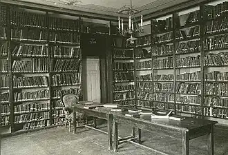 When the German Army took Lublin during World War II, they stripped the interior and may have burned the vast library in the town square. An officer who witnessed the event reported that a brass band played while a Jewish throng loudly wept as the books burned. Recent reporting suggests that the library was not completely destroyed, and more than 800 volumes of the once 15-40,000 volume library have been identified.[4] The building became the regional headquarters of the German Military Police.[5] After the war, in the autumn of 1945, the property was taken over by the state as an abandoned possession and assigned to the newly established Maria Curie-Skłodowska University. It was used by the Medical University of Lublin.
