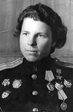 Yevdokiya Andreyevna Nikulina (Russian: Евдокия Андреевна Никулина; 8 November [O.S. 26 October] 1917 – 23 March 1993) was a squadron commander in the 46th Taman Guards Night Bomber Aviation Regiment who was awarded the title Hero of the Soviet Union on 26 October 1944.
