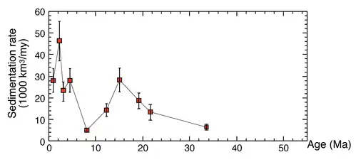 The sediments filled in the Yinggehai Basin came mostly from Tibet plateau and was transported mostly by the Red River, and the depocenter has migrated southward since the Oligocene. The peaks in sediment was during the Miocene and the Plio-Pleistocene (Figure 4).[1]