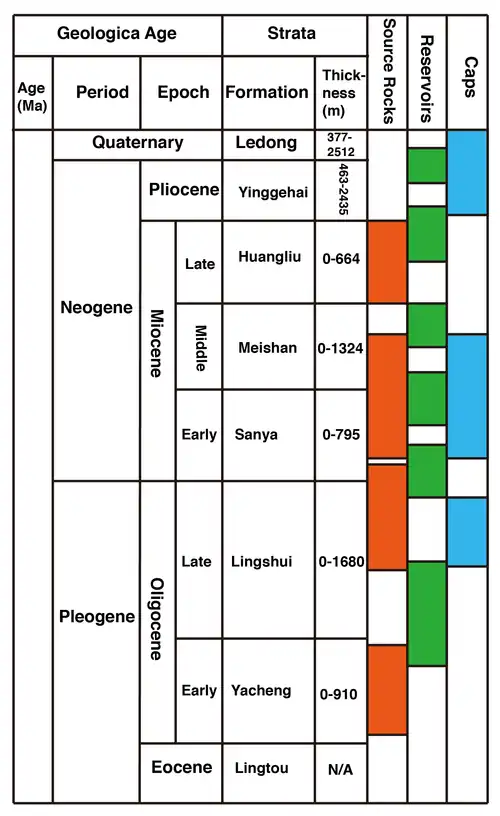 Late Miocene (Huangliu formation): shale, shaly sandstone, and sandstone from littoral to bathyal basin floor fan environment. The thickness is around 0–664.