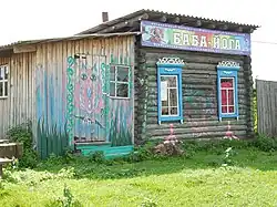 A "Baba Yoga" club in Okunevo, Omsk Oblast. In Ynglism, Baba Yaga, whose original name is Baba Yoga, meaning the "Yogini Mother", is a goddess representing female yujists who initiate orphan children to the Aryan gods through a fire rite, to make them priests and leaders of communities; she would have been demonised by the Christians, who turned her into the old hag who eats children of modern Russian folklore.[86][87]