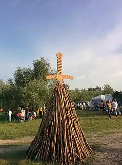 Contrary to other Rodnover traditions which prefer that collective worship is held at shrines consisting of wooden idols (капь, kap') and other ritual elements placed in clearings or natural open holy spaces, Ynglism emphasises that worship should be held inside walled temples.[95] The worship of the gods and the ancestors is conducted by the Ynglists through a detailedly elaborated liturgy in which the style of speech and behaviour of the participants are similar to those of Orthodox Christians.[96] Also similar is the strict regulation of performance, timing and content of prayers and appeals; the Ynglists conduct rituals and recite prayers at precise times of the day and before or after undertaking certain actions, such as before beginning to work, before going to sleep, and similar others.[97] Prayers, speech formulations, are held to be energetic vibrations directed to certain gods, thus going to certain stars and constellations which are the bodies of such gods; Slavo-Aryan prayers are meant to go mainly to the northern celestial pole, Svarga.[98] Yearly gatherings (veche) of great numbers of Ynglist believers are held in summer.[45]