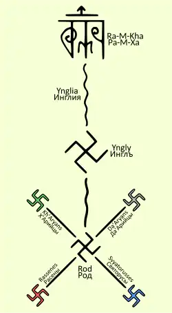 Scheme of the theology of Omskian Ynglism: Ra-M-Kha begets Ynglia-Yngly, which begets Rod, from which depart the four ramifications of the Slavo-Aryans.