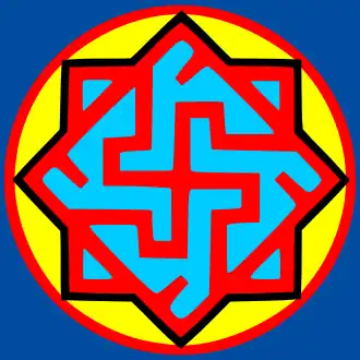 The symbol of Ynglism as a body of religious believers (church).[1] It represents Yngly, the fiery radiance, word and action of the supreme God begetting and ordering the universe, as the spinning astral images of the northern culmen of the sky (Iriy or Svarga, "Heaven").[α]