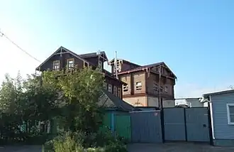 The headquarters of the Ynglist Church in Omsk, in 2016, including the residence of Aleksandr Khinevich in the foreground and the Temple of the Wisdom of Perun (Капище Веды Перуна) in the background