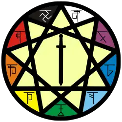 According to Ynglist theology, the Ynglia (Инглия; Ynglist rune: ), called Yngly when personified (Ингли, Инглъ; cf. the Germanic Yng, Yngwi, whose Scandinavian runic consists of square symbols → , and cf. the Germanic suffix "-ing", implying the action of generation and production) is the structural order of the universe and of all phenomena, characterised as a fiery radiance emanated by the supreme God,[50] the "One Indivisible God" (Единый Неделимый Бог, Yediny Nedelimy Bog),[51] named Ra-M-Kha (Ра-М-Ха; Ynglist runes: ) in Ynglist terminology.[18][28] Ra-M-Kha is absolute, unknowable, unfathomable, and yet manifests itself as the gods generating all phenomena in accordance with the supreme order, the Ynglia.[18] The latter is personified as Yngly, the intelligence of God, keeper of the source of the fire of the universe, and model of the earliest progenitor of humanity, Rod.[52] Yngly-Ynglia is represented by the swastika symbol, which Ynglists call the "image of Yngly" and consider the first written symbol of humanity,[2] as well as the symbol for the "defense of the native land and of the holy faith".[24]