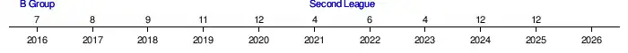 | 2015–16 | B Group | 2 | 30 | 12 | 5 | 13 | 41 | 41 | +0 | 41 | 7th | 11 | |