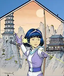 Yoko Tsuno is an electronics engineer, raised in Japan but now living in Belgium. She is quite compassionate and has a knack for making friends. Yoko is also a skilled scuba diver, holds a black belt in aikido, and can pilot jets, gliders and helicopters. This wide range of competences, together with her near-flawless behaviour, makes Yoko fall into the classic category of a competent woman. The flaw she does admit to having is the typically Japanese trait of valuing personal honour highly, which leads her at times to be trusting to the point of blindness. Yoko Tsuno's first name was inspired by Japanese actress Yoko Tani.[5]