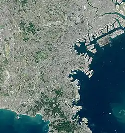 Yokohama (Japanese: 横浜; pronounced [jokohama] ⓘ) is the second-largest city in Japan by population[1] as well as by area, and the country's most populous municipality.[a] It is the capital and most populous city in Kanagawa Prefecture, with a population of 3.7 million in 2023. It lies on Tokyo Bay, south of Tokyo, in the Kantō region of the main island of Honshu. Yokohama is also the major economic, cultural, and commercial hub of the Greater Tokyo Area along the Keihin Industrial Zone.