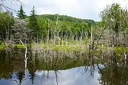 About 370 acres (1.5 km2) in the Stockbridge-Yokun Ridge Reserve, or about 6 percent of the area, had been conserved using the Forest Legacy Program as of 2000.[17][18] The northern boundary of the Stockbridge-Yokun Ridge Reserve conservation zone includes Mud Pond and its surrounding wetlands, and the outlying summit of South Mountain 1,388 feet (423 m). Both are located in Pittsfield.