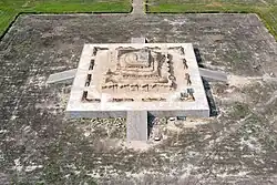 The Yongning Pagoda or Yongning Temple (simplified Chinese: 永宁寺; traditional Chinese: 永寧寺; pinyin: Yǒngníng Sì) in Luoyang was one of the tallest buildings of the world from 516 AD to 534 AD. The timber-frame pagoda with a complete column grid and a stabilising masonry-core was built during the Northern Wei in 516 AD, but is no longer extant.[1] Possibly nine stories high, of which seven were made of earth platforms with wooden verandas, and the top two stories being completely out of wood.[2] One source states that it was 90 zhang (about 240 m (790 ft)) high, plus a 10 zhang high pinnacle, which is thought to be an exaggeration.[1] More reliable sources suggest that it may have been 40 zhang (about 100 m (330 ft))[3] or 49 zhang high,[1] including the pinnacle[4] having possibly had a top height of 137, 147,[5] or with a pinnacle of extra 7 zhang even 154.95 m (508.4 ft), making it the tallest building in the world at that time and the tallest pagoda ever built until the completion of the Tianning Temple (Changzhou) in 2007. According to evidence unearthed by modern archaeological excavation, the pagoda had a square foundation of rammed earth with a width of 38.2 m (125 ft). The earthen foundation was covered by a 2.2 m (7.2 ft) thick layer of limestone bricks. Pillar bases have been discovered at each corner of the pagoda. According to Yang Xuanzhi who lived in Luoyang in the year 520, the pagoda could be seen from as far as 50 km (30 mi). The Yongning Pagoda was destroyed in 534 when it was struck by lightning and caught fire.[3]