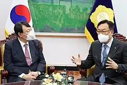 On 30 July 2021, Yoon officially joined the conservative People Power Party (PPP), which was the main opposition party in South Korea.[66] Prior to this, Yoon had been a political independent, although his popular support came primarily from conservatives. Yoon was welcomed into the PPP by Choi Jae-hyung, a fellow 2022 presidential candidate, in a small public ceremony at the PPP headquarters located in Yeouido, Seoul. Choi was the former head of the Board of Audit and Inspection and had also just recently joined the PPP, officially having become a member on 15 July. Yoon's welcoming ceremony into the People Power Party notably did not include recently elected party leader Lee Jun-seok, who had been outside of Seoul at the time.[66]