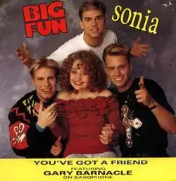 "You've Got a Friend" is a song written and produced by Stock Aitken Waterman and performed by Sonia and Big Fun, and featuring Gary Barnacle on sax. The song, a midtempo pop ballad, was released as a charity single for the Childline foundation on June 11, 1990. Initially the artists recorded the well-known Carole King song of the same name, but for reasons unknown it was ultimately not used and SAW wrote an original song with the same name instead. The cover version was finally released in the 2010 re-issue of Big Fun's album, A Pocketful of Dreams. The single peaked at number 14 in the UK and number 12 in Ireland. It was later included on Big Fun's Japanese edition of their debut album A Pocketful of Dreams.