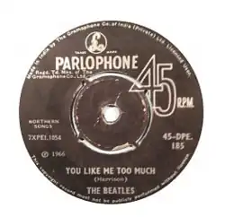 "You Like Me Too Much" is a song by the English rock band the Beatles. It was written by George Harrison, the group's lead guitarist, and released in August 1965 on the Help! album, except in North America, where it appeared on Beatles VI.[2] The band recorded the track on 17 February that year at EMI Studios in London.[2]