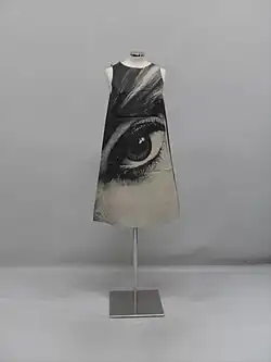 Mary Quant, often credited for inventing the mini-skirt, was a leader in the boutique movement and attributed her primary source of inspiration to the street style of the youth. Boutiques Biba, Bazaar and Paraphernalia housed talent like Betsey Johnson and Emmanuelle Khanh and utilized mass-production to fill their shops with the latest trends.[1] These boutiques were key players in London and the US as they were the first to cater specifically to the youth market with a modern approach: "clothes displayed like art in a gallery, cooler-than-thou young salesgirls, and rock and roll blaring from the speakers—shops that marketed clothes as part of a whole, deliriously amusing lifestyle".[2] The Scott Paper Company took advantage of mass-production and created disposable chemise dresses out of their patented Dura-Weave paper. Mass-production gave Scott the ability to print a diverse assortment of eye-catching patterns and Pop Art inspired motifs that appealed to the youth consumer.