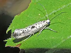 The wingspan of Yponomeuta plumbella ranges from 16 to 20 millimeters.[4] In the imago the fore wings are white punctuated with three rows of very small black spots (hence the family name of ermine moths) while the hindwings are greyish. These moths are clearly distinguished from related species by the larger black splotch in the middle of the inner rim of the forewing and the black marking at the tip of the forewing.[4] The legs and the long antennae are white.