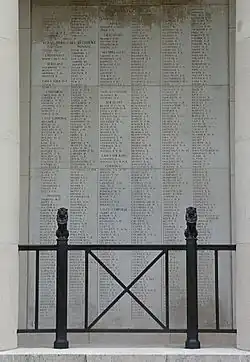 The inscription inside the archway is similar to the one at Tyne Cot, with the addition of a prefatory Latin phrase: "Ad Majorem Dei Gloriam, a centuries-old traditional text meaning 'To the greater glory of God'. – Here are recorded names of officers and men who fell in Ypres Salient, but to whom the fortune of war denied the known and honoured burial given to their comrades in death". This inscription, proposed by Rudyard Kipling, is matched by the main overhead inscription on both the east- and west-facing façades of the arch, which he personally composed.[6] On the opposite side of the archway to that inscription is the shorter dedication: "They shall receive a crown of glory that fadeth not away". There are also Latin inscriptions set in circular panels either side of the archway, on both the east and west sides: "Pro Patria" and "Pro Rege" ('For Country' and 'For King'). A French inscription mentions the citizens of Ypres: "Erigé par les nations de l'Empire Britannique en l'honneur de leurs morts ce monument est offert aux citoyens d'Ypres pour l'ornement de leur cité et en commémoration des jours où l'Armée Britannique l'a défendue contre l'envahisseur", which translated into English means: "Erected by the nations of the British Empire in honour of their dead, this monument is offered to the citizens of Ypres for the ornament of their city and in commemoration of the days where the British Army defended it against the invader."[7][8]