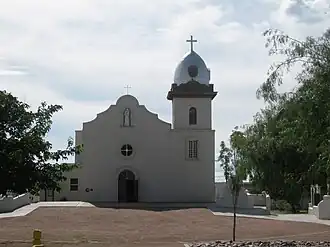 Over the next two centuries the mission was relocated several times due to flooding of the Rio Grande. In 1829 one such flood washed away the structure. The flood also resulted in the river cutting a new course further south and the area where the church had been located was no longer considered a part of Mexico but of the Republic of Texas.[8] In 1897 the structure was remodeled and the now familiar gables and bee-hive bell tower were added. A fire in 1907, caused by chemicals stored in the bell tower to repel bats, resulted in massive damage to the building. The church was rebuilt in 1908 and remains much the same today. The church prospered and in 1918 Our Lady of Mount Carmel School was established and remained open until 2005 when the church closed it.[7] The Texas Historical Commission erected historical markers at the Ysleta Mission in the following years: 1936 – First mission and pueblo in Texas,[9] 1962 – Site of first mission in Texas,[2] and 1970 – Oldest mission in Texas.[3] On July 31, 1972, the Ysleta Mission was added to the National Register of Historic Places.[10]