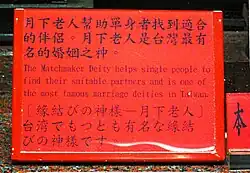 Yue Lao (Chinese: 月下老人; pinyin: Yuè Xià Lǎorén; lit. 'old man under the moon') is a god of marriage and love in Chinese mythology.[1] He appears as an old man under the moon. Yue Lao appears at night and "unites with a silken cord all predestined couples, after which nothing can prevent their union."[2] He is immortal[3] and is said to live either in the moon[2] or in the "obscure regions" (Yue ming), the Chinese equivalent of Hades.[3] His legends serve as the basis for the Red thread of fate.