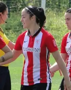 She retired as a player ten years later aged 32,[5] having made 203 official appearances for the club in all competitions and scored 67 goals (15th and 6th place respectively in Athletic's historical rankings at that time).[6] She was honoured with a farewell ceremony and a last starting appearance - along with fellow departing veterans Garazi Murua and Eunate Arraiza - on the final matchday of the 2023–24 Liga F season, in which Athletic defeated Sevilla 2–1 at San Mamés.[7][8]