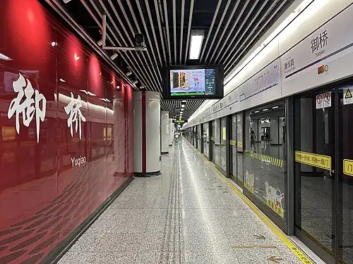 Yuqiao (simplified Chinese: 御桥; traditional Chinese: 御橋; pinyin: Yùqiáo) is a Shanghai Metro interchange station in Pudong, Shanghai, located at the intersection of Yuqiao Road and Yuqing Road in Beicai town. It is served by Lines 11 and 18. The station opened as part of Line 11's phase 2 extension on August 31, 2013.[1] It became an interchange station with Line 18 when the southern portion of phase 1 of that line opened on 26 December 2020.[2] It served as the northern terminus of Line 18, which consists of eight stations between Yuqiao and Hangtou, until the line was further extended northward to South Changjiang Road on December 30, 2021.[3][4][5]