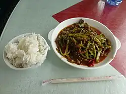 Yuxiang shredded pork (simplified Chinese: 鱼香肉丝; traditional Chinese: 魚香肉絲; pinyin: yúxiāng ròusī; sometimes translated as fish-flavored pork slices, or more vaguely as shredded pork with garlic sauce)[1] is a common dish in Sichuan cuisine. Yuxiang is one of the main traditional flavors in Sichuan.