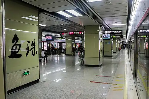 Yuzhu Station (Chinese: 鱼珠站), formerly Maogang Station (茅岗站) during planning,[1][2] is an interchange station between Line 5 and Line 13 of the Guangzhou Metro, and also serves as Line 13's western terminus.[3] It is located under Yumao Road (鱼茅路) near the south of the Maogang Interchange (茅岗立交) on Huangpu Avenue (黄埔大道) in the Huangpu District.[4] It opened on 28 December 2009.[5]