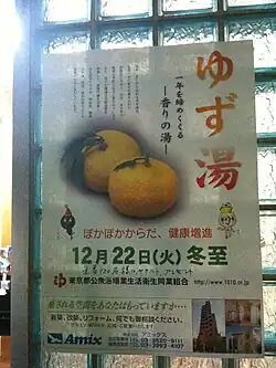 A yuzu bath, also known as a yuzuyu (柚子湯), is a bathing tradition that is celebrated on the winter solstice in Japan. Yuzu fruits, citrus fruit of East Asian origin known for their characteristically strong aroma and the fragrant oil from their skin (nomilin), are floated in the hot water of the bath, releasing their aroma. The fruit may also be floated cut in half, allowing the citrus juice to mingle with the bathwater and color it yellow-orange, or enclosed in a cloth bag. Alternatively, yuzu-scented bath salts are used.[1] Yuzu baths are believed to guard against colds, treat the roughness of skin, warm the body, and relax the mind.[2][3]