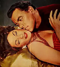 De Carlo then received an offer from Mark Hellinger to make another film with Burt Lancaster: the film noir Criss Cross (1949). This time De Carlo had a larger role, as a femme fatale, Anna. Bosley Crowther noted that De Carlo was "trying something different as Anna. The change is welcome, even though Miss de Carlo's performance is uneven. In that respect, she is right in step with most everything else about Criss Cross."[76] The film has become regarded as a classic and De Carlo considered the role the highlight of her career to date.[77] Tony Curtis made his debut in the movie, in a scene dancing with De Carlo.[78]