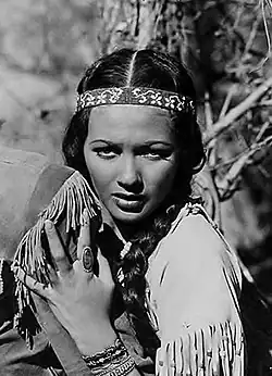 Shortly after losing the Tremartini role, De Carlo was loaned to Republic Pictures to portray Native American princess Wah-Tah in Deerslayer.[56] It was her first featured role in a full-length film. At Paramount, she played unbilled bit roles in True to Life (1943) and Standing Room Only (1944).[57] She also tested for the role of Lola in Double Indemnity (1944).[58] She was billed in a short, Fun Time (1944) and went to MGM to play an uncredited lady-in-waiting in Kismet (1944).[57]