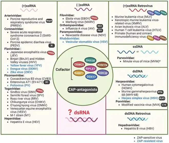 - ^ Shao R, Visser I, Fros JJ, Yin X (2024-08-26). "Versatility of the Zinc-Finger Antiviral Protein (ZAP) As a Modulator of Viral Infections". International Journal of Biological Sciences. 20 (12): 4585–4600. doi:10.7150/ijbs.98029. PMC 11414379. PMID 39309436.