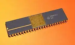 The development of dynamic RAM at ZMD continued with the 16-kilobit U256 and the 64-kbit U2164. First laboratory samples of the U2164 were obtained in 1981.[9] In 1984 the U2164 was presented at the Leipzig Spring Fair.[10] Pilot production at ZMD started in 1986.[9] In 1988 mass production of the U2164 began at VEB Mikroelektronik "Karl Marx" Erfurt.[9] For comparison, internationally 64-kbit chips became available commercially around 1980.[9] The pilot production of the 256-kbit U61256 started in 1988, and the 1-Mbit U61000 followed in 1989.[9] Neither of those two could be transferred to mass production until German Reunification in 1990.[11] About 35,000 U61000 were manufactured in 1988 and 1989.[11] Production of the U61256 suffered from an industrial accident in July 1989 and the yield dropped from an already low 6.1% to below 1%.[9] The development of the megabit chip U61000 was much publicized at the time as proof of the capability of East German industry and the socialist system in general. Kombinat Carl Zeiss Jena used the U61000 to advertise its semiconductor manufacturing equipment. For this reason the U61000 bore the Carl Zeiss Jena logo while most other integrated circuits from ZMD kept the previous ZFTM logo.