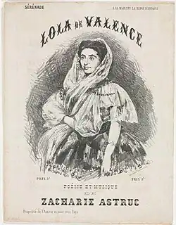 Astruc was a hispanophile, well versed in the art and literature of Spain. After his own trip to Spain in 1864, he helped prepare the itinerary for Manet's only trip to Spain in 1865 by sending him a "long and effusive" itinerary, and later praised Manet's Spanish-inspired paintings as the work of "the artist who revealed Spain to the French."[4][5] Astruc helped to promote a widespread revival of interest in El Greco's paintings.[6] He wrote a song dedicated to the Spanish dancer Lola de Valence in 1863, which was printed with a reproduction of a painting by Manet of de Valence as cover art.[1]