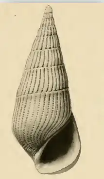 The base of the shell is rather short and well rounded, marked by the continuations of the axial ribs, and 20 spiral cords which become successively stronger from the periphery to the umbilical area. The aperture is very oblique, decidedly channeled at the posterior angle and at the junction of the columella and the basal lip. The outer lip is decidedly twisted, reinforced immediately behind the edge with a thick callus, posterior portion drawn forward into a claw-shaped element. The columella is short, twisted, reflected over and appressed to the base. The parietal wall is covered with a thick callus, which renders the peritreme complete.[2]