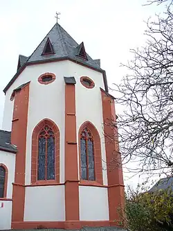 In the outlying centre of Merl stands Saint Michael's Parish Church, until 1805 the Franciscan monastery church. The church on the thoroughfare near the Moselle has on the High Altar an "Antwerp retable" from about 1520. The sacristy was built with one support to a nearly square floor plan. In the parish hall, remnants of mediaeval wall paintings have been preserved, and the old dormitory's roof frame in the monastery wing, which is not open to the public, is said to be one of the few mediaeval roof constructions still preserved in Germany.