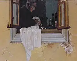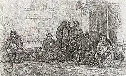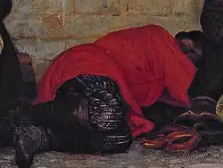 Another man, also sitting on the porch, is sadly reflecting while sprinkling salt on his bread. He is offered salt by a peasant standing near him, whose friendly gesture and open expression show a sincere desire to help his comrade.[48] The artist's attention to detail is evident, such as the calloused hands carefully sprinkling salt on the bread, as well as the two rags in which the salt itself is wrapped.[51] Next to these two peasants is an old man leaning on a stick, whose gaze is full of bitterness.[48] He is one of the most vivid images in the canvas: in his hunched figure from years of labor and wrinkled face "you can read the simple and bitter story of his life".[38] In the center of the painting, under an open window, is a good-natured peasant "with a lively, sly look" who holds a bundle of young green onions in his hand. He is wary, listening to what is going on in the room above him,[48] —perhaps to the clinking of chafing dishes.[51] To his left lies a peasant in a brightly colored kumacha shirt. His clothes look newer than those of the other peasants—perhaps he is the youngest of them.[17] He sleeps with his head resting on his bag, his face almost invisible. The image of the peasant sitting by the wall in the leftmost part of the painting, with his pose, gaze, and tilt of the head, as well as "some special self-deepening," is in harmony with the blond-haired peasant in a blue shirt sitting on the porch in the right part of the canvas. According to Irina Shuvalova, "their similar, symmetrically placed figures balance and close the central group, giving the composition stability and completeness".[48] Art historian Mikhail Alpatov also noted that "the two on the edges are deliberately placed strictly frontally, symmetrically — this is an attempt to give the scene monumentality".[52]