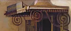 The action takes place against the background of a light-colored wall of a house, above the porch of which is the inscription Uezd Zemstvo.[37] The wall is old, with cracks and in some places crumbling plaster; in one spot, someone has drawn a little man.[38] The bright midday sun is shining. The resting and dining peasants are seated by the wall and porch.[37][39] Their figures are arranged frontally, in a single row; there is no external action in the painting.[17] Nevertheless, the impression that the canvas shows "an ordinary scene of quiet provincial life" is deceptive. Looking more closely, one can see that the sitting and standing peasants have "concentrated and pensive frowning faces".[37][40]