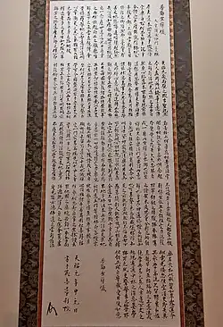 In Chinese Chan, the usage of esoteric mantras in Zen goes back to the Tang dynasty. There is evidence that Chan Buddhists adopted practices from Chinese Esoteric Buddhism in findings from Dunhuang.[136] According to Henrik Sørensen, several successors of Shenxiu (such as Jingxian and Yixing) were also students of the Zhenyan (Mantra) school.[137] Influential esoteric dhāraṇī, such as the Uṣṇīṣa Vijaya Dhāraṇī Sūtra and the Nīlakaṇṭha Dhāraṇī, also begin to be cited in the literature of the Baotang school during the Tang dynasty.[138] The eighth century Chan monks of Shaolin temple also performed esoteric practices such as mantras and dharanis.[139] Many mantras have been preserved since the Tang period and continue to be practiced in modern monasteries. One common example is the Śūraṅgama Mantra, which is commonly chanted by monastics as part of the morning liturgy (朝誦 Cháosòng) and evening liturgy (暮誦 Mùsòng) in temples.[140][141] Various rituals that continue to be practiced by Chan monastics, such as the tantric Yujia Yankou rite and the extensive Shuilu Fahui ceremony, also involve esoteric aspects, including maṇḍala offerings, deity yoga and the invocation of esoteric deities such as the Five Wisdom Buddhas and the Ten Wisdom Kings.[123][142][143]