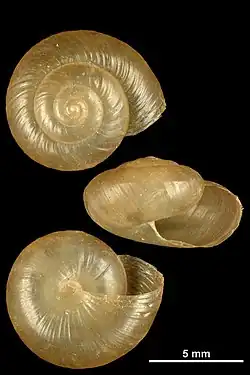 The 4-6 x 6-10 mm shell has 4.5-5 convex whorls with moderate suture. It is slightly shouldered above the periphery, the aperture is usually without a lip inside and the umbilicus is very narrow, and partly covered by the reflected columellar margin. The shell is pale brown, very finely striated, thin and transparent.[4]