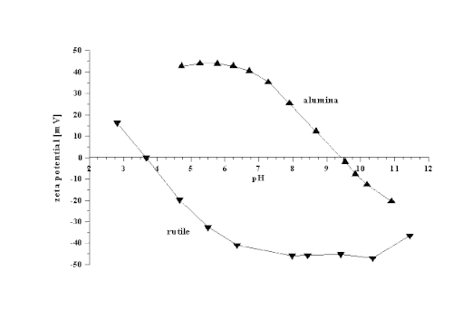 The iso-electric point is one such property. The iso-electric point is the pH value at which the zeta potential is approximately zero. At a pH near the iso-electric point (± 2 pH units), colloids are usually unstable; the particles tend to coagulate or flocculate. Such titrations use acids or bases as titration reagents. Tables of iso-electric points for different materials are available.[2] The attached figure illustrates results of such titrations for concentrated dispersions of alumina (4% v/v) and rutile (7% v/v). It is seen that iso-electric point of alumina is around pH 9.3, whereas for rutile it is around pH 4. Alumina is unstable in the pH range from 7 to 11. Rutile is unstable in the pH range from 2 to 6.